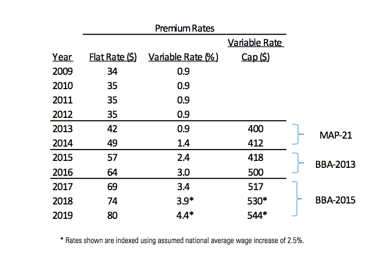 Prior to 2013, premium rates were relatively stable for several years, with the FRP set at $34-$35 and the VRP set at 0.9% of UVBs. With the passage of MAP-21, BBA-2013, and BBA-2015, rates increased per the following schedule: