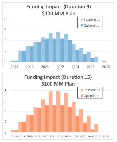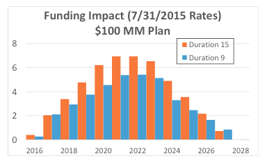 Let’s begin with a summary of the estimated effect on plan contributions for our shorter (duration 9) and longer (duration 15) duration plans. For the sake of simplicity, we consider a plan with a 2015 funding target of $100 million.