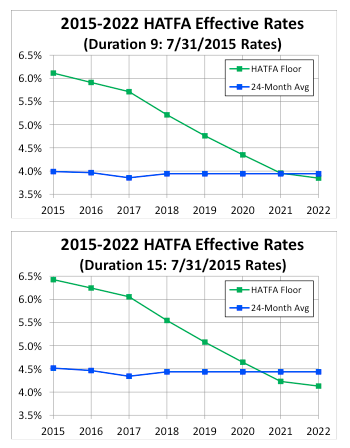 As a practical matter, the HATFA rates are the liability valuation rates for plan funding purposes until around 2020. The following charts show valuation interest rates used for calculating liabilities for funding our shorter duration and longer duration example plans, assuming no change in interest rates after July 31, 2015. We call this the ‘baseline’ case.