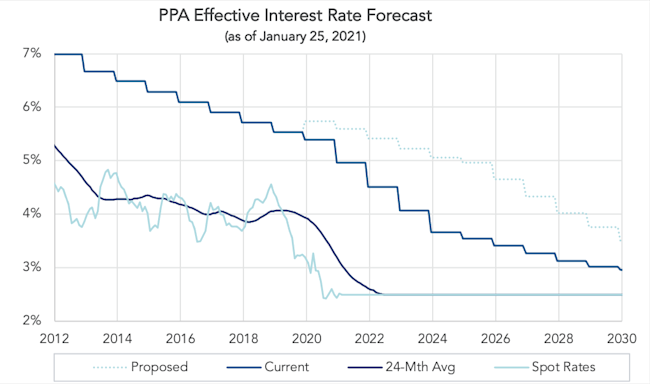 The bill provides that “if the average of the first, second, or third segment rate for any 25-year period is less than 5 percent, such average shall be deemed to be 5 percent.” This floor would have the effect of immediately increasing the first segment rate. If interest rates continue at their current levels, this floor will apply to the second segment rate beginning in 2025 and the third segment rate beginning in 2029. By 2030, rates will have reached the lowest level achievable under this law, 3.50%.