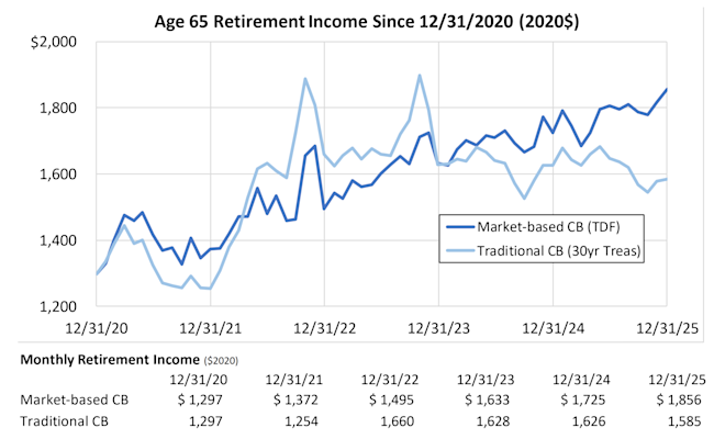 In our last article, we looked at the retirement income “performance” of a 55-year-old 401(k) plan participant invested in a 2030 target date fund over the period 2021-2025: How much age-65 retirement income the participant could “buy” with her 401(k) account balance at the end of 2020 vs. at the end of 2025, given the performance of assets, interest rates, and inflation over the last five years.