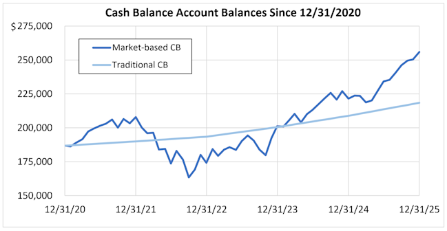 But if you are looking at the amount of retirement income these account balances can buy over the 2021-2025 period you get the opposite result: the traditional cash balance plan shows significantly more volatility than the market-based cash balance plan.