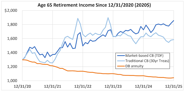 In our last article we concluded that, over the last five years (end-of-2020 vs. end-of-2025) in DC plans, the most significant factor determining the retirement income outcome for a DC participant is when she annuitizes. The reason: inflation during the period 2021-2025 significantly eroded the buying power of the (dollar-denominated) 2020 annuity. And over 2021-2025 (partly inflation-driven) increases in interest rates, combined with modest asset gains, doubled the amount of annuity the participant could buy if she delayed annuitization to 2025. In this article, we consider how these same three market factors – inflation, interest rates, and asset performance – affected DB participants under different DB plan designs.