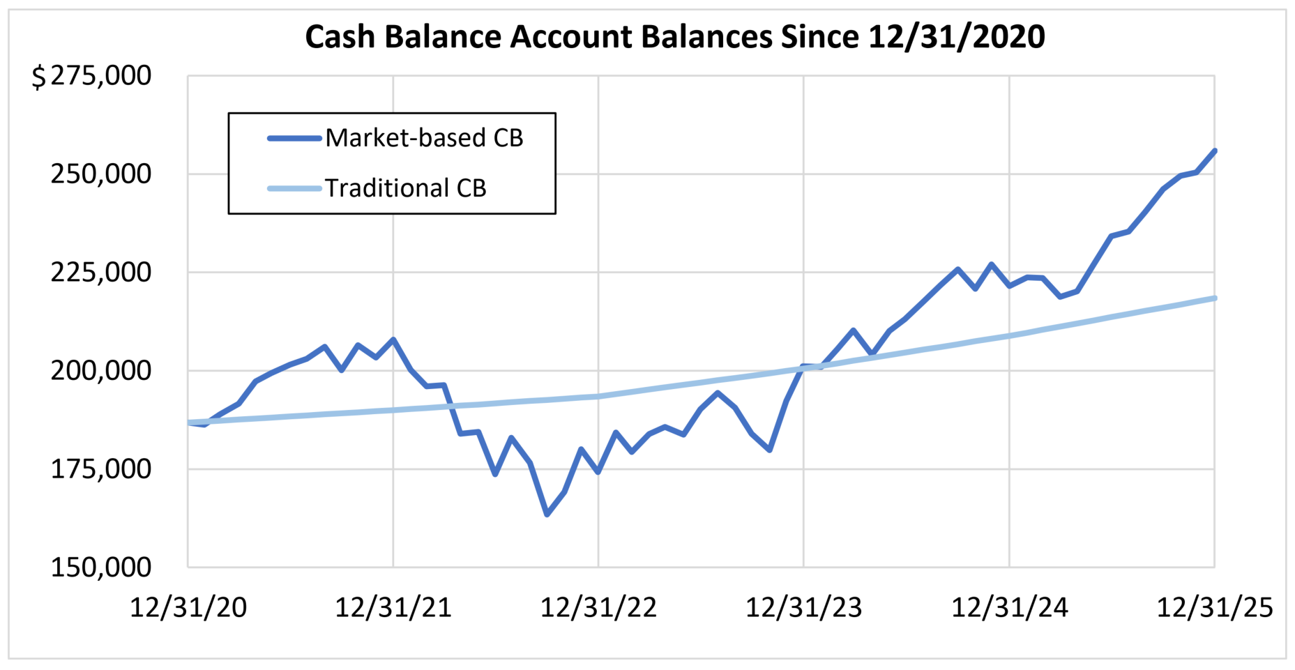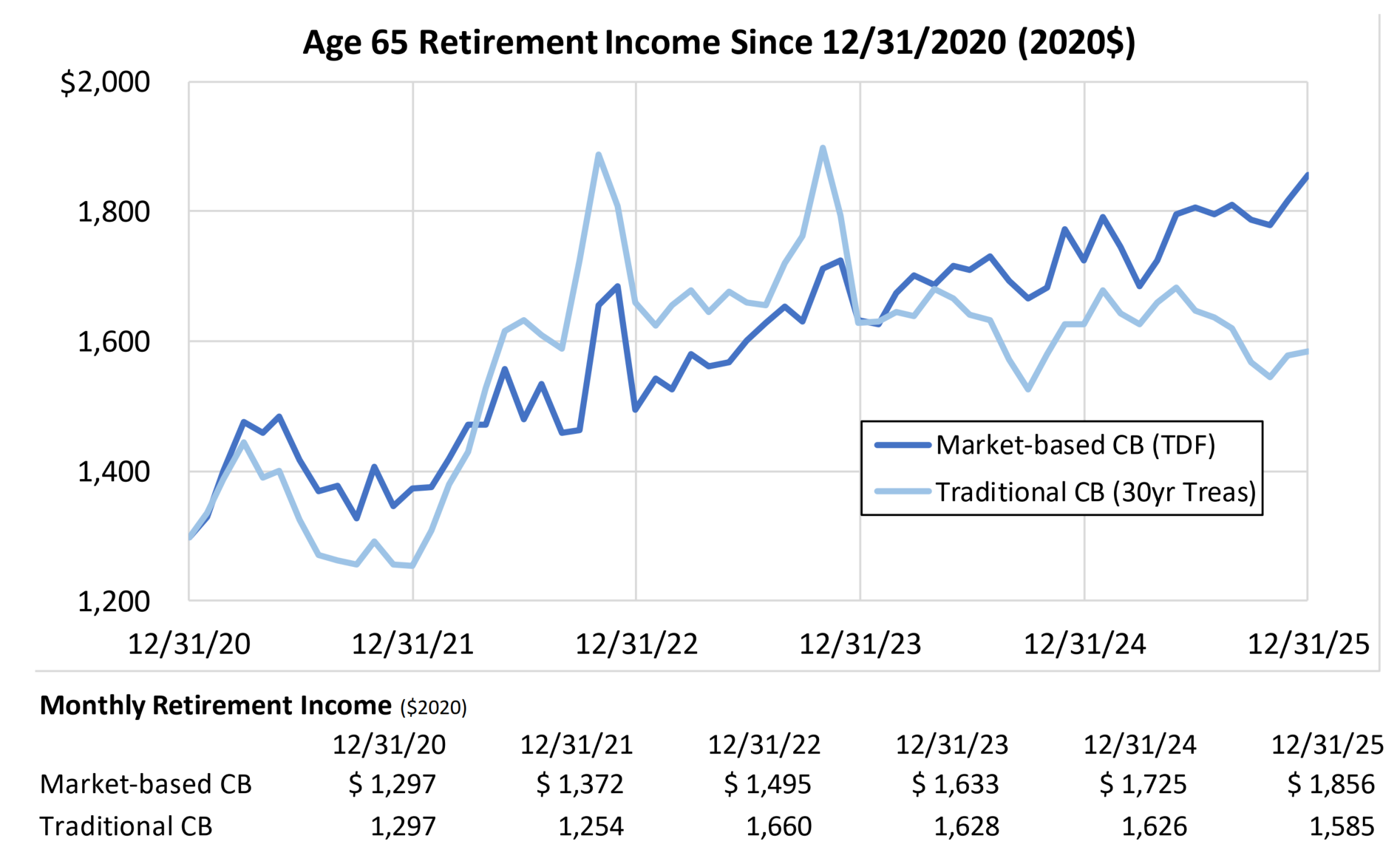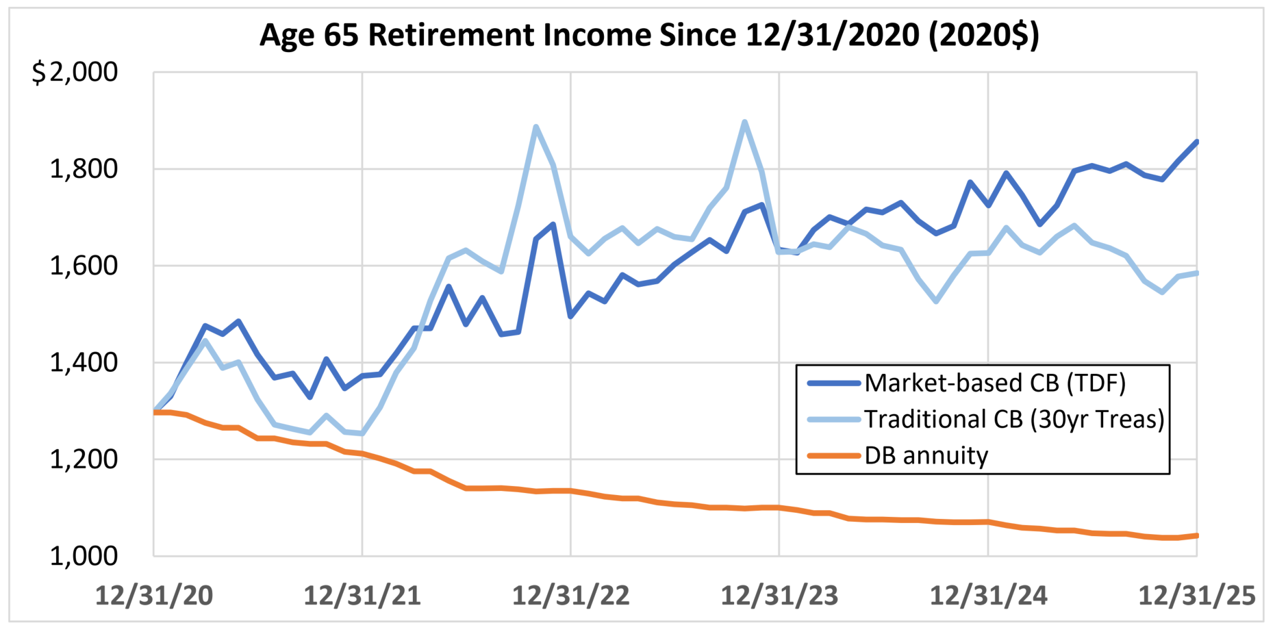But if you are looking at the amount of retirement income these account balances can buy over the 2021-2025 period you get the opposite result: the traditional cash balance plan shows significantly more volatility than the market-based cash balance plan.