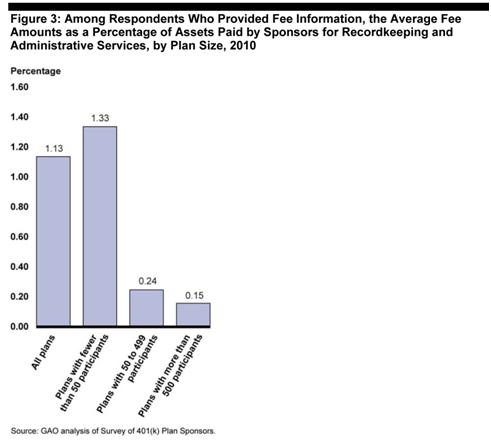 It’s fair to say that most observers would agree with this conclusion. The degree to which small plan fees are higher than large plan fees, however, may be disputed. The chart below summarizes GAO’s findings: