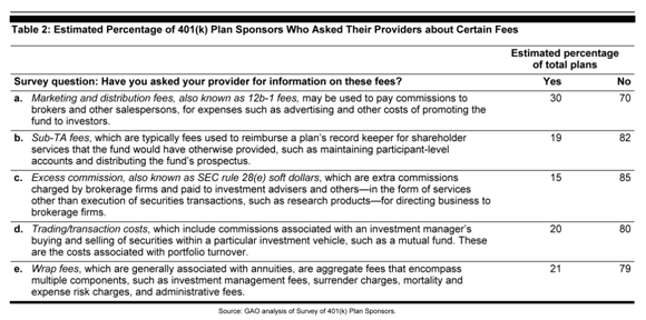 Certainly most would agree that some sponsors could do more to inform themselves about plan fees; the Tussey v. ABB case raises this issue. The extent to which GAO found that sponsors were uninformed and do not ask about fees, however, may be controversial. The following table illustrates GAO’s findings in this regard.