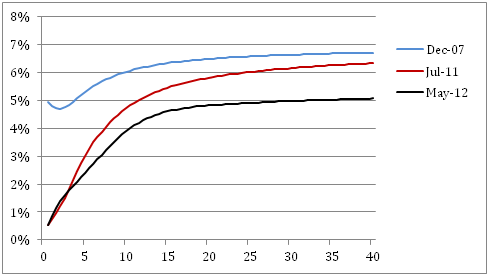 The following chart shows the shape of the corporate bond yield curve for the months of December 2007, July 2011 and May 2012. The significant (80-120 basis point) drop in medium- and long-term interest rates from July 2011 to May 2012 includes the impact of the Fed’s Operation Twist.