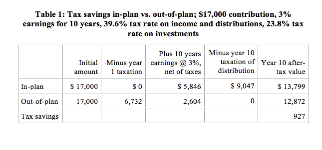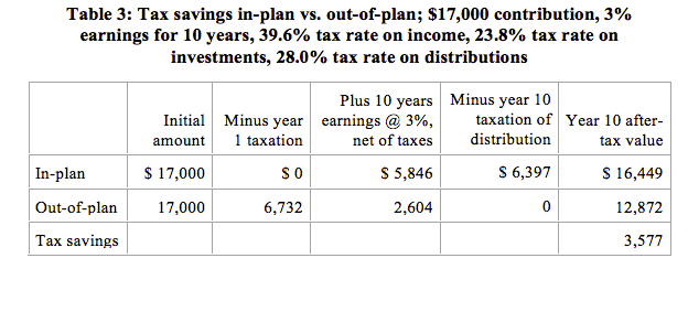 Finally, the value of the benefit increases significantly if the tax rate on distribution is lower than the tax rate on contribution. In this case, you are in effect shifting income from a high tax year to a lower tax year. Here’s our first table again, but this time assuming that the in-plan savings are taxed at 28% on distribution, rather than 39.6%.