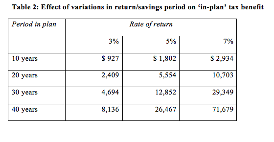 This value is significantly affected by two factors – how long you leave your money in the plan and what your earnings rate is. The following table shows the impact of changing those assumptions.