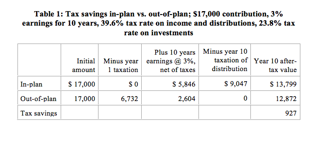 When you do the math, you discover that the two most important tax benefits for retirement savings are the non-taxation of trust earnings and (where this is relevant) any shifting of income from a high tax rate year (the year of contribution) to a lower tax rate year (the year of distribution). To figure out how much taxes you are saving, you then have to compare what you’re getting from the plan with what you would have gotten if you saved outside the plan. That’s your tax benefit.