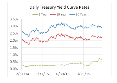 Below is a chart showing 1-, 10- and 30- year Treasury Yield Curve rates for 2015 (through December 21).