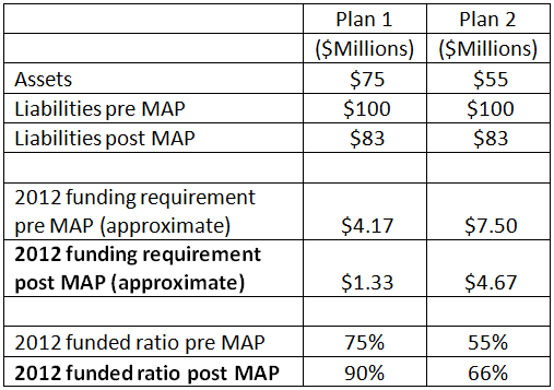 We provide this information simply to show that MAP-21 funding relief will, for some plans at least, be a “big deal” in 2012 (and, for that matter, 2013). It will reduce funding requirements significantly (relative to what they would have been), and it will increase funded ratios significantly.
