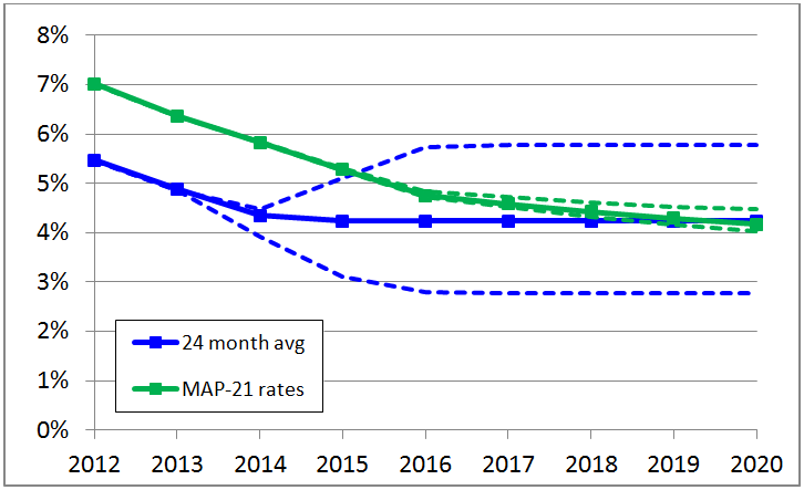 The following chart projects to 2020: (1) MAP-21 rates; (2) 24-month average rates (i.e., the rates that would have applied but for MAP-21); and (3) sensitivity — 24-month average rates if rates go down 100 basis points or up 200 basis points.