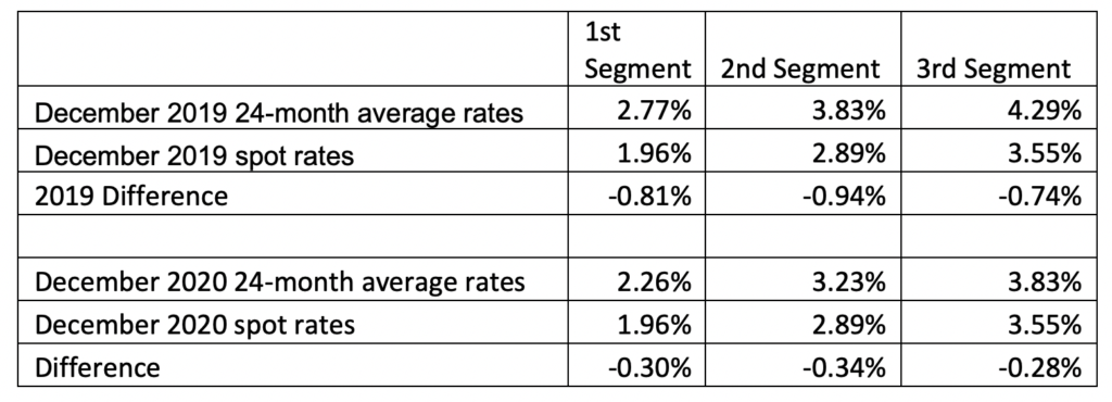 If interest rates remain at current levels, savings from adopting the spot rate method for 2019 would be more than offset by significantly higher premiums in 2020 and 2021. That result obtains regardless of what lookback month is used.