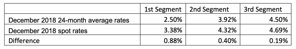As noted, the 2019 PBGC variable rate premium is determined based on 2018 UVBs, determined using spot or 24-month average interest rates as of December 2018 (assuming the plan uses a December 2018 lookback month for plan funding). Interest rates went up significantly during 2018, and as a result December 2018 spot rates are significantly higher than 24-month average rates.