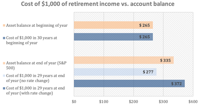 Here’s the chart: The story we just related is, more or less, what happened in 2019. The following chart shows the change this year in the cost of $1,000 30 years from now. The participant had an opening account balance that was exactly equal to the cost a 30-year strip at the beginning of the year.
