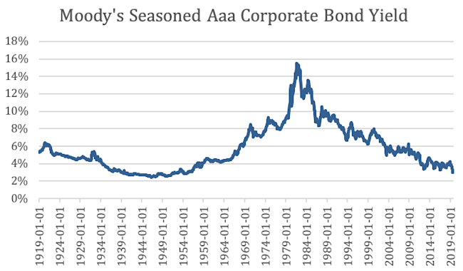 Below is a chart of the yield on high-quality corporate bonds for the last 100 years.