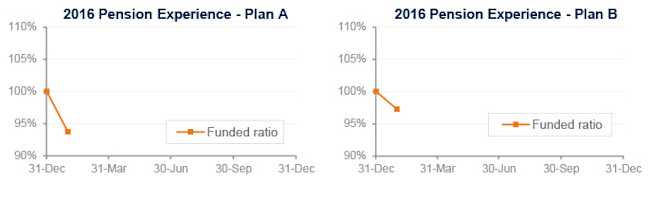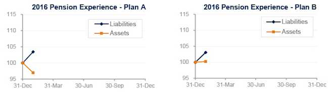 1 Plan A is a traditional plan (duration 12 at 5.5%) with a 60/40 asset allocation, while Plan B is a cash balance plan (duration 9 at 5.5%) with a 20/80 allocation with a greater emphasis on corporate and long-duration bonds. For both plans, we assume the plan is 100% funded at the beginning of the year and ignore benefit accruals, contributions, and benefit payments in order to isolate the financial performance of plan assets versus liabilities.
