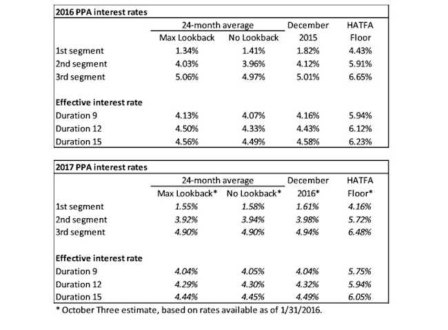 The table below summarizes rates that plan sponsors are required to use for IRS funding purposes for 2016, along with estimates for 2017. Pre-relief, both 24-month averages and December ‘spot’ rates, which are still required for some calculations, such as PBGC premiums, are also included.
