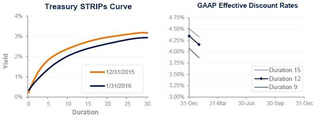Pension liabilities (for funding, accounting, and de-risking purposes) are now driven by market interest rates. The graph on the left compares Treasury STRIPs yields at December 31, 2015, and January 31, 2016. The graph on the right shows our estimate of movements in effective GAAP discount rates for pension obligations of various duration during 2016: