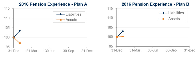 1 Plan A is a traditional plan (duration 12 at 5.5%) with a 60/40 asset allocation, while Plan B is a cash balance plan (duration 9 at 5.5%) with a 20/80 allocation with a greater emphasis on corporate and long-duration bonds. For both plans, we assume the plan is 100% funded at the beginning of the year and ignore benefit accruals, contributions, and benefit payments in order to isolate the financial performance of plan assets versus liabilities.