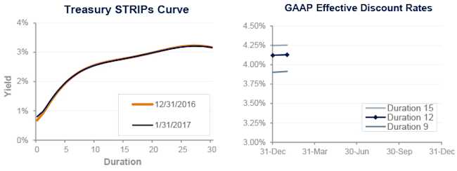 Pension liabilities (for funding, accounting, and de-risking purposes) are now driven by market interest rates. The graph on the left compares Treasury STRIPs yields at December 31, 2016, and January 31, 2017. The graph on the right shows our estimate of movements in effective GAAP discount rates for pension obligations of various duration during 2017:
