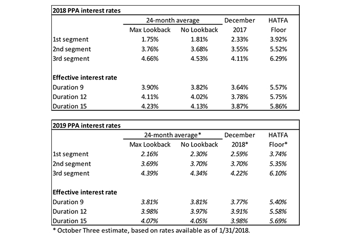 The table below summarizes rates that plan sponsors are required to use for IRS funding purposes for 2018, along with estimates for 2019. Pre-relief, both 24-month averages and December ‘spot’ rates, which are still required for some calculations, such as PBGC premiums, are also included.