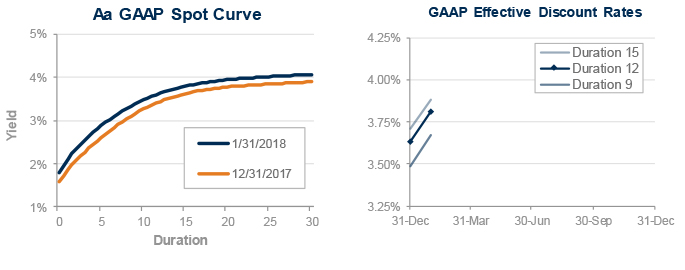 Pension liabilities (for funding, accounting, and de-risking purposes) are now driven by market interest rates. The graph on the left compares our Aa GAAP spot yield curve at December 31, 2017, and January 31, 2018. The graph on the right shows our estimate of movements in effective GAAP discount rates for pension obligations of various duration during 2018: