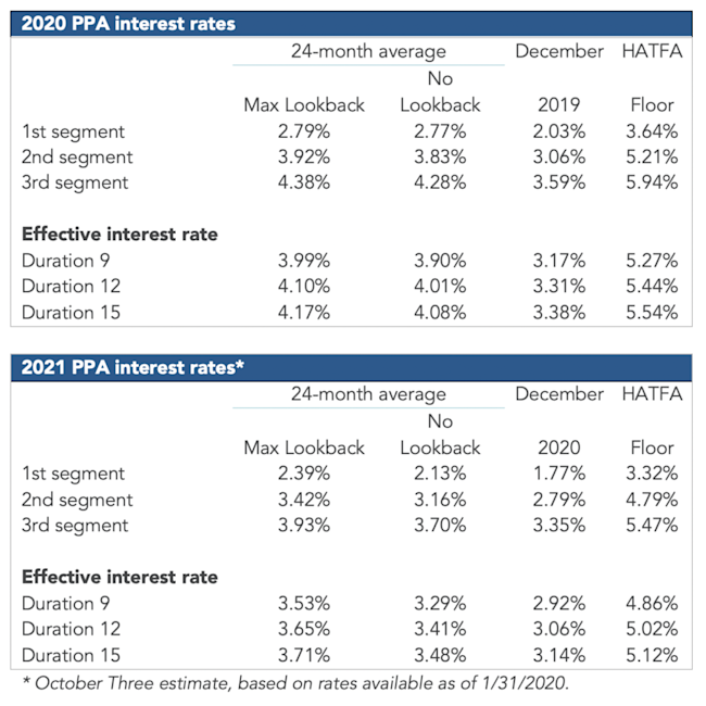The table below summarizes rates that plan sponsors are required to use for IRS funding purposes for 2020, along with estimates for 2021. Pre-relief, both 24-month averages and December ‘spot’ rates, which are still required for some calculations, such as PBGC premiums, are also included.