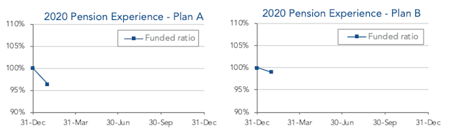 [1]Plan A is a traditional plan (duration 12 at 5.5%) with a 60/40 asset allocation, while Plan B is a largely retired plan (duration 9 at 5.5%) with a 20/80 allocation with a greater emphasis on corporate and long-duration bonds. We assume overhead expenses of 1% of plan assets per year, and we assume the plans are 100% funded at the beginning of the year and ignore benefit accruals, contributions, and benefit payments in order to isolate the financial performance of plan assets versus liabilities.
