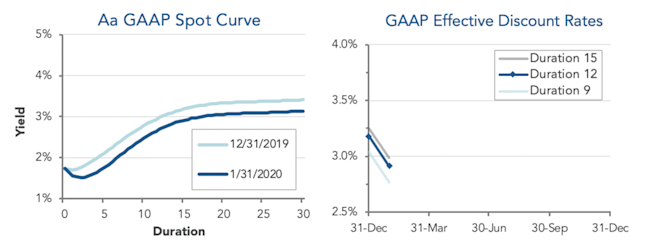 Pension liabilities (for funding, accounting, and de-risking purposes) are driven by market interest rates. The first graph below compares our Aa GAAP spot yield curve at December 31, 2019 and January 31, 2020. The second graph below shows our estimate of movements in effective GAAP discount rates for pension obligations of various duration during January: