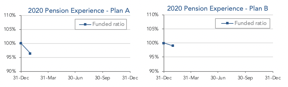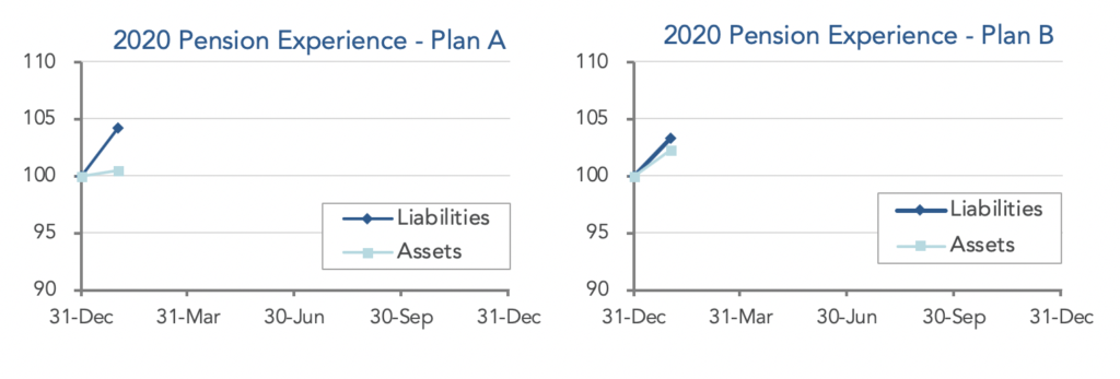 [1]Plan A is a traditional plan (duration 12 at 5.5%) with a 60/40 asset allocation, while Plan B is a largely retired plan (duration 9 at 5.5%) with a 20/80 allocation with a greater emphasis on corporate and long-duration bonds. We assume overhead expenses of 1% of plan assets per year, and we assume the plans are 100% funded at the beginning of the year and ignore benefit accruals, contributions, and benefit payments in order to isolate the financial performance of plan assets versus liabilities.