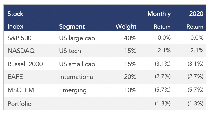Stock indexes, other than NASDAQ, lost ground last month, with a diversified stock portfolio falling more than 1%: