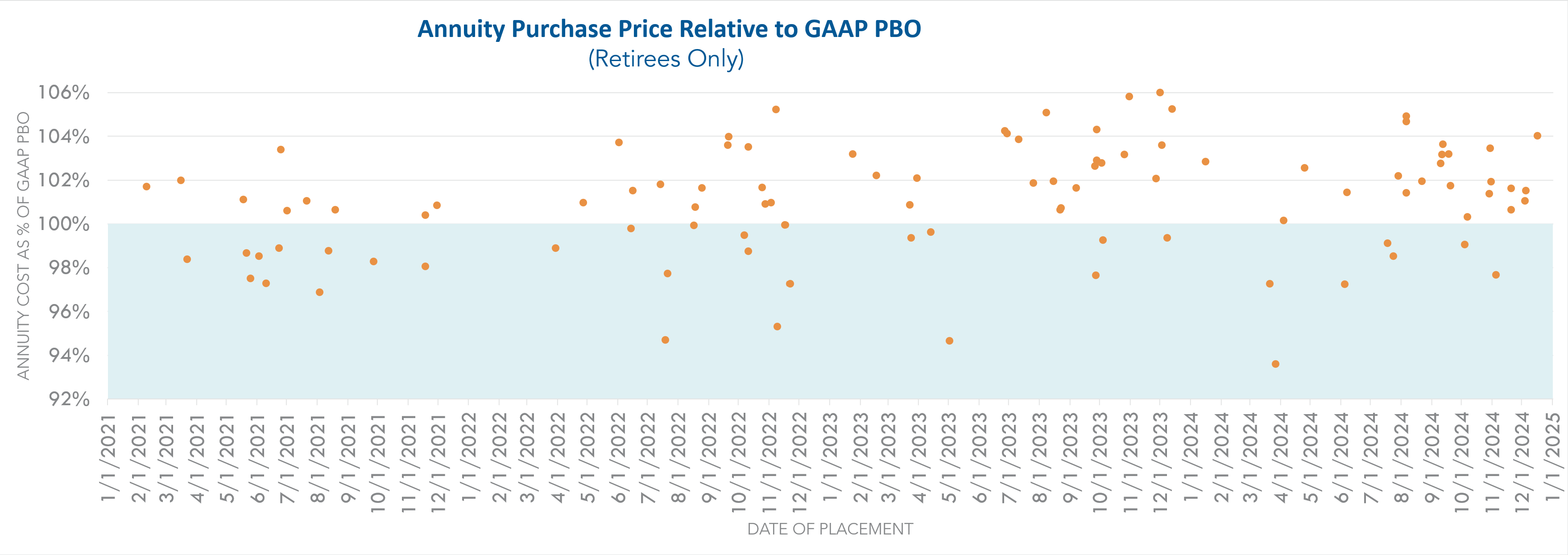 The graph below represents the annuity purchase price relative to GAAP projected benefit obligation (PBO) of the retiree cases placed by October Three Annuity Services since 2021. In 2023, annuity purchase cost for retirees was on average 102.52% of the accounting book value. In 2024 average annuity purchase cost of retiree transactions placed by October Three Annuity Services was 101.32% of GAAP PBO. Since 2021, the average purchase cost was 101.21% of accounting book value.