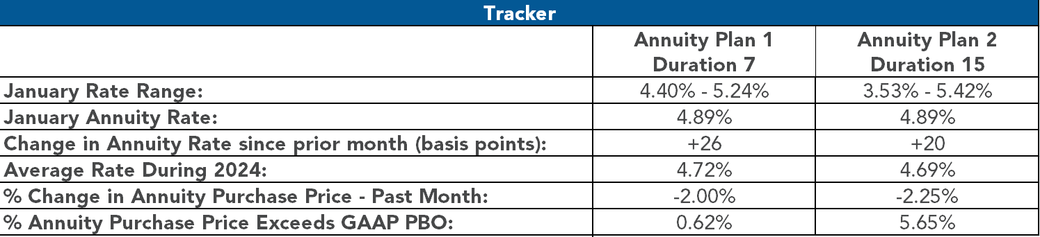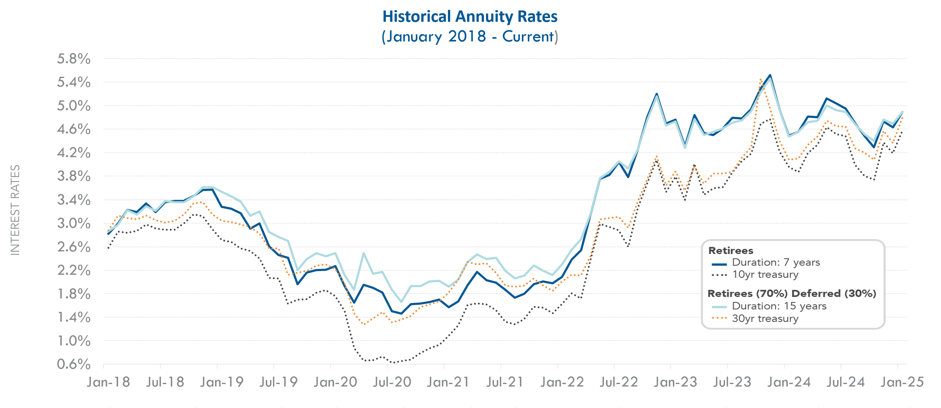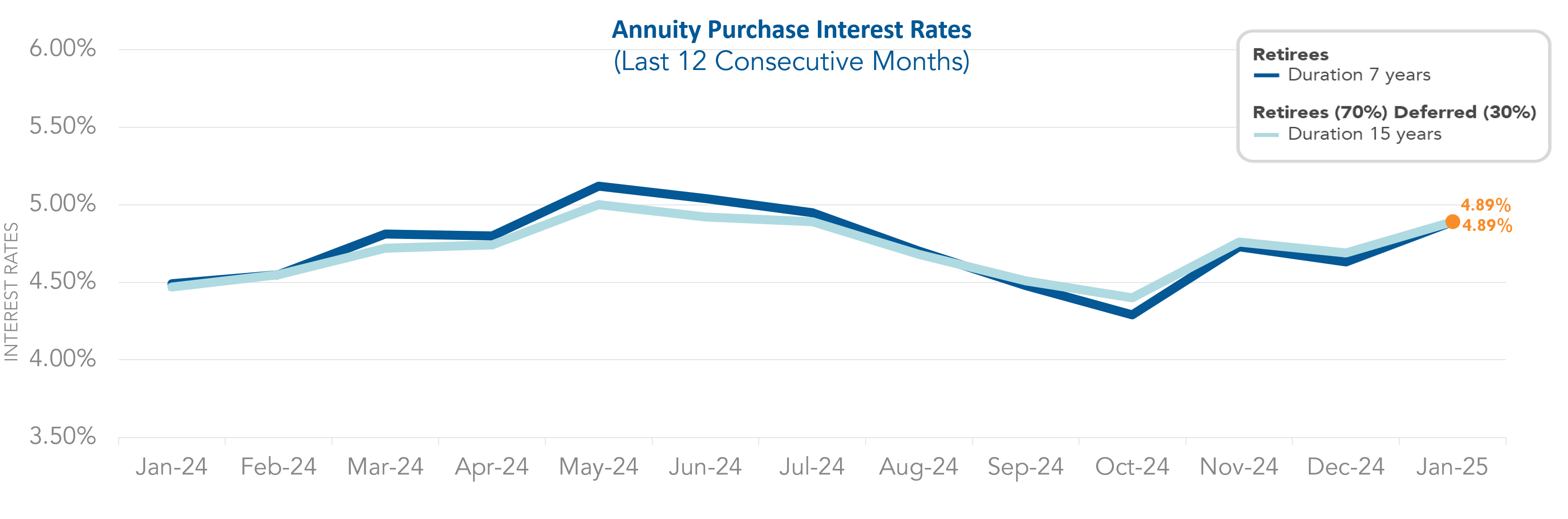 We are kicking off 2025 with increases in both the average duration 7 and average duration 15 rates, which have both risen to 4.89%. This is an excellent start for 2025, as 4.89% exceeds the overall averages we saw for both rates in 2024. Since October 2024, we have witnessed steady improvement in rates overall. As noted in the Pension Finance Update, pension finances have been steadily improving, with most pension plan sponsors once again seeing better funding ratios. With rates starting off strong in 2025, now is the ideal time for plan sponsors to connect with an annuity search firm and begin the process of settling their plan’s liabilities to achieve their derisking goals under optimal conditions.