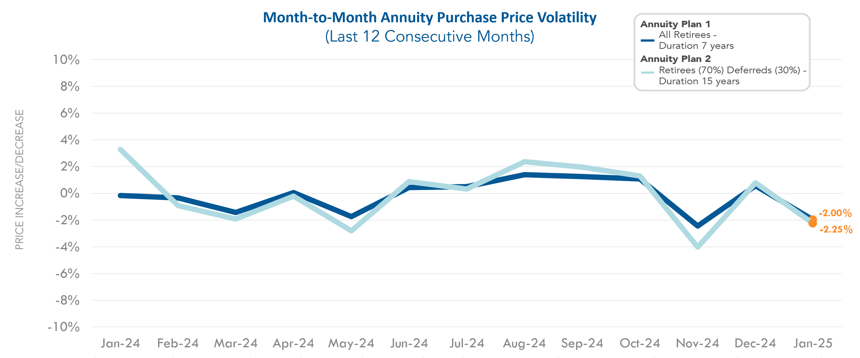 This month, annuity purchase prices for both Annuity Plan 1 and Annuity Plan 2 declined. The purchase price for Annuity Plan 1 fell by 2.00%, while Annuity Plan 2 experienced a decrease of 2.25%. Entering the insurance market early is vital during the planning stage, given the frequent short-term volatility in annuity purchase pricing. Plan sponsors who are terminating their pension plans can take advantage of favorable fluctuations and attractive rates by settling the retiree portion of their liabilities.