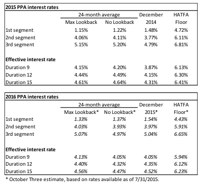 The table below summarizes rates that plan sponsors are required to use for IRS funding purposes for 2015, along with estimates for 2016. Pre-HATFA, both 24-month averages and December ‘spot’ rates, which are still required for some calculations, such as PBGC premiums, are also included.