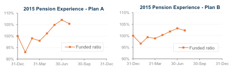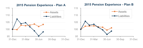 1 Plan A is a traditional plan (duration 12 at 5.5%) with a 60/40 asset allocation, while Plan B is a cash balance plan (duration 9 at 5.5%) with a 20/80 allocation with a greater emphasis on corporate and long-duration bonds. For both plans, we assume the plan is 100% funded at the beginning of the year and ignore benefit accruals, contributions, and benefit payments in order to isolate the financial performance of plan assets versus liabilities.