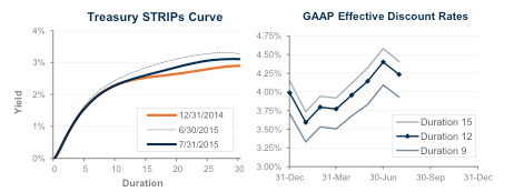 Both funding and accounting liabilities are now driven by market interest rates. The graph on the left compares Treasury STRIPs yields at December 31, 2014, and July 31, 2015, and also shows the movement in rates last month. The graph on the right shows our estimate of movements in effective GAAP discount rates for pension obligations of various duration during 2015 so far: