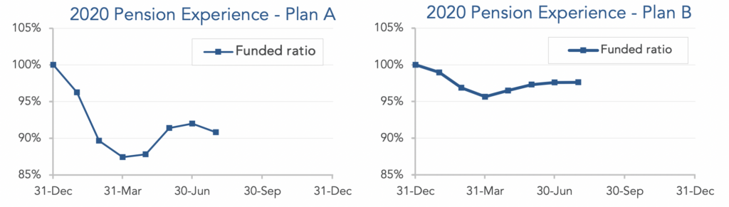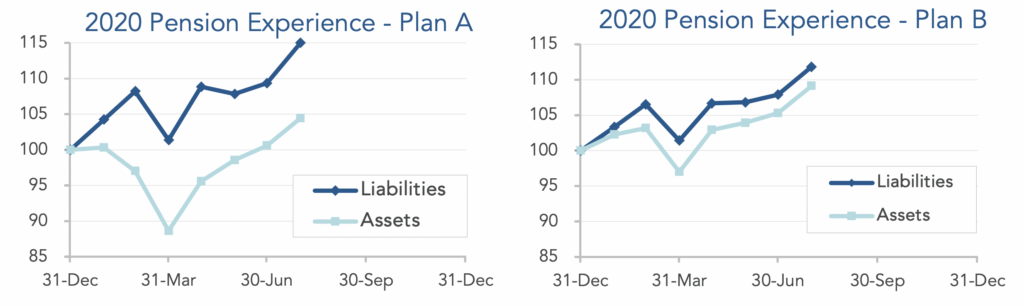 What looked like a bear market for stocks earlier this year now looks more like one more “turn of the screw” for lower long-term interest rates, a trend that has run for almost 40 years, encompassing the career of most people now working and bedeviling pension finance all century. The graphs below show the movement of assets and liabilities for our two model plans during the first seven months of 2020: