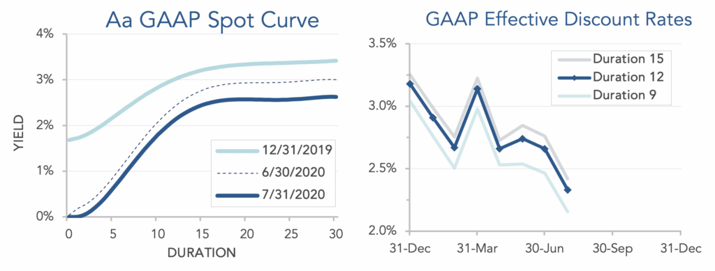 Pension liabilities (for funding, accounting, and de-risking purposes) are driven by market interest rates. The first graph below compares our Aa GAAP spot yield curve at December 31, 2019 and July 31, 2020, and it also shows the movement in the curve last month. The second graph below shows our estimate of movements in effective GAAP discount rates for pension obligations of various duration during 2020: