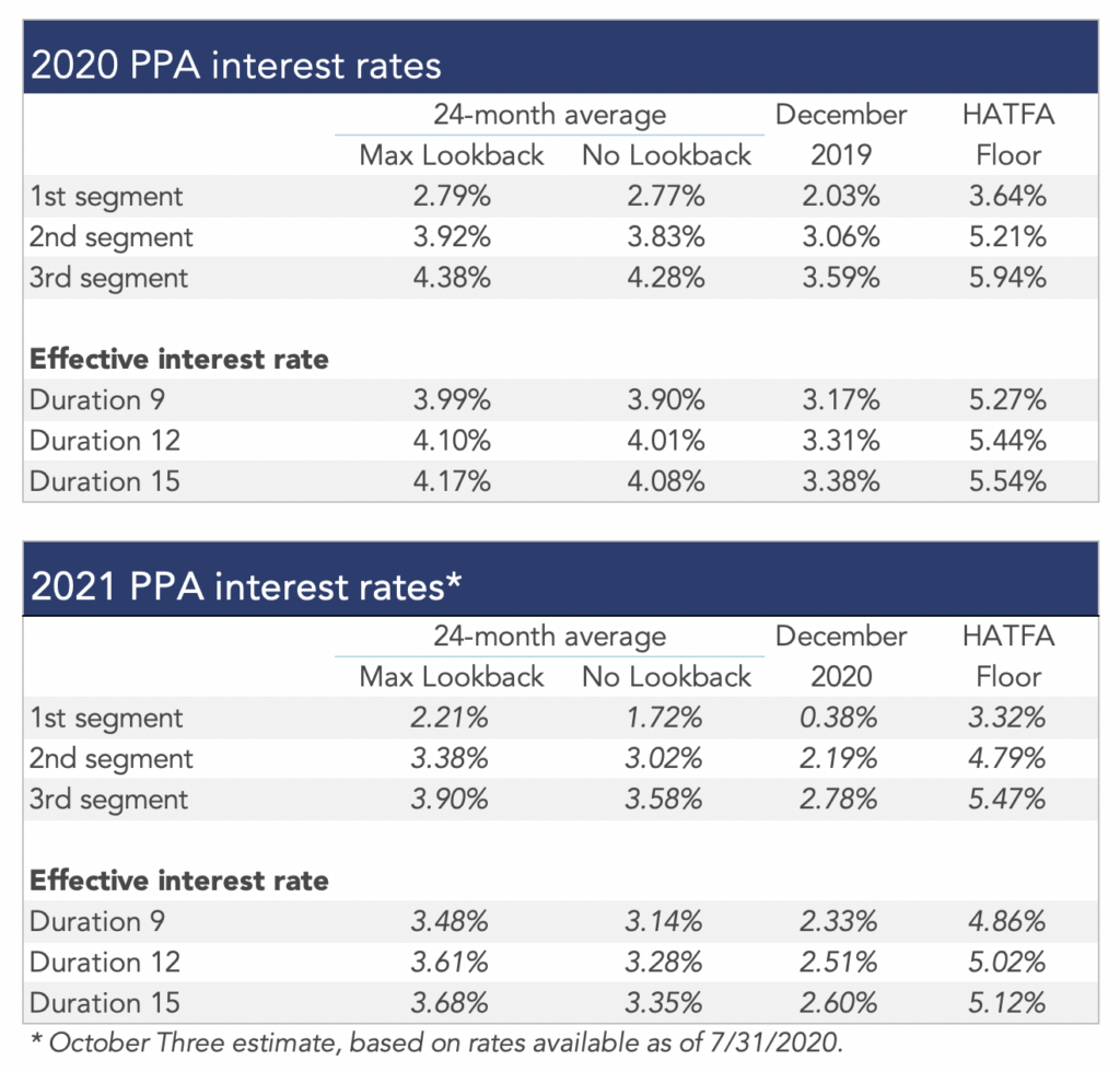 The table below summarizes rates that plan sponsors are required to use for IRS funding purposes for 2020, along with estimates for 2021. Pre-relief, both 24-month averages and December ‘spot’ rates, which are still required for some calculations, such as PBGC premiums, are also included.