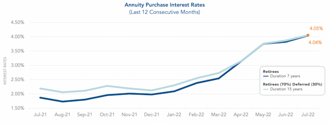 • The average Annuity Purchase Interest rates jumped again this past month, with the average duration 7 rate at 4.04% and average duration 15 at 4.05%. **