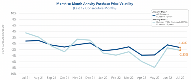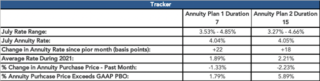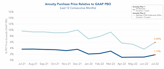 The graph below displays the difference between annuity purchase price above GAAP projected benefit obligation (PBO). We refer to GAAP PBO and accounting book value interchangeably. In July 2022, the spread for Annuity Plan 1 slightly increased to 1.79% and 5.89% for Annuity Plan 2. Although it widened, the spread is still substantially lower than the historical averages. An increase in annuity purchase rates generally lowers annuity purchase prices relative to accounting book value. Please note, that the below PBO calculations exclude future overhead costs paid by plan sponsors to retain participants in the plan. Administrative expenses and PBGC premiums are examples of these overhead costs. Future overhead costs would narrow the spread, though the extent is plan specific.