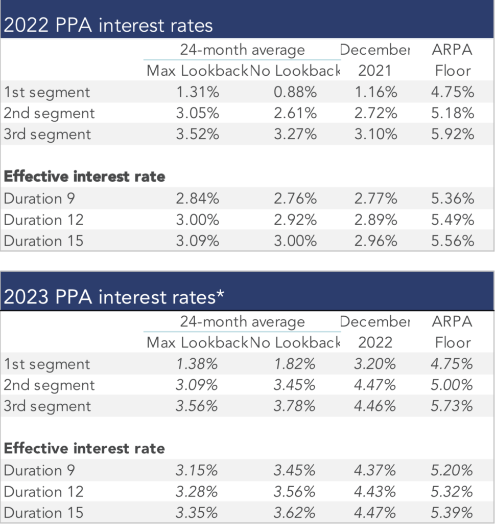 The table below summarizes rates that plan sponsors are required to use for IRS funding purposes for 2022, along with estimates for 2023. Pre-relief, both 24-month averages and December ‘spot’ rates, which are still required for some calculations, such as PBGC premiums, are also included.