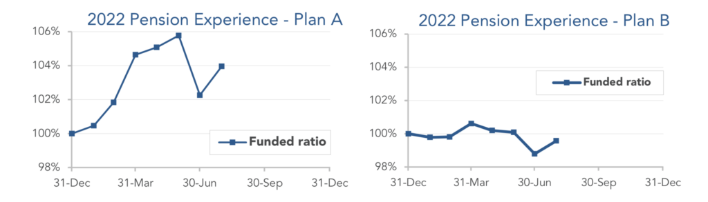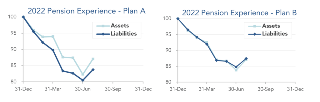 While the first half of 2022 saw falling stocks and rising interest rates, July gave us a sharp reversal: higher stocks and lower interest rates. The net effect has been neutral to modestly positive for most pension plans this year. The graphs below show the movement of assets and liabilities during the first seven months of 2022: