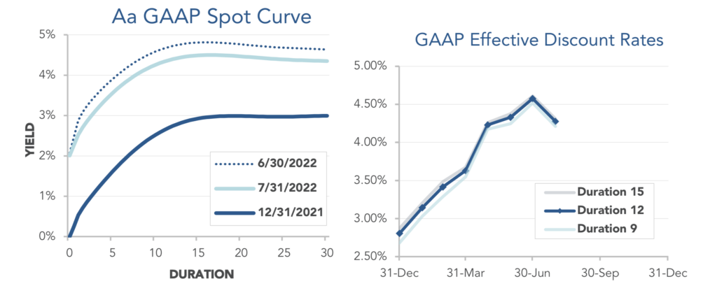 Pension liabilities (for funding, accounting, and de-risking purposes) are driven by market interest rates. The first graph below compares our Aa GAAP spot yield curve at December 31, 2021 and July 31, 2022, and it also shows the movement in the curve last month. The second graph below shows the change in effective GAAP discount rates for pension obligations of various duration so far during 2022: