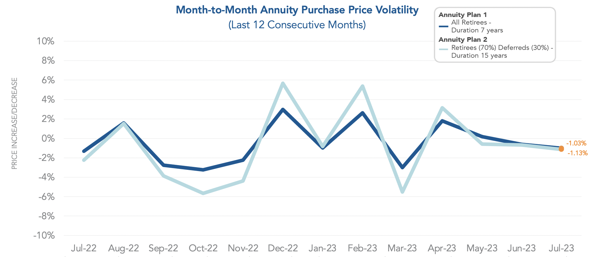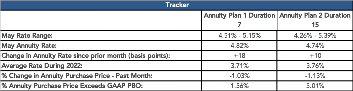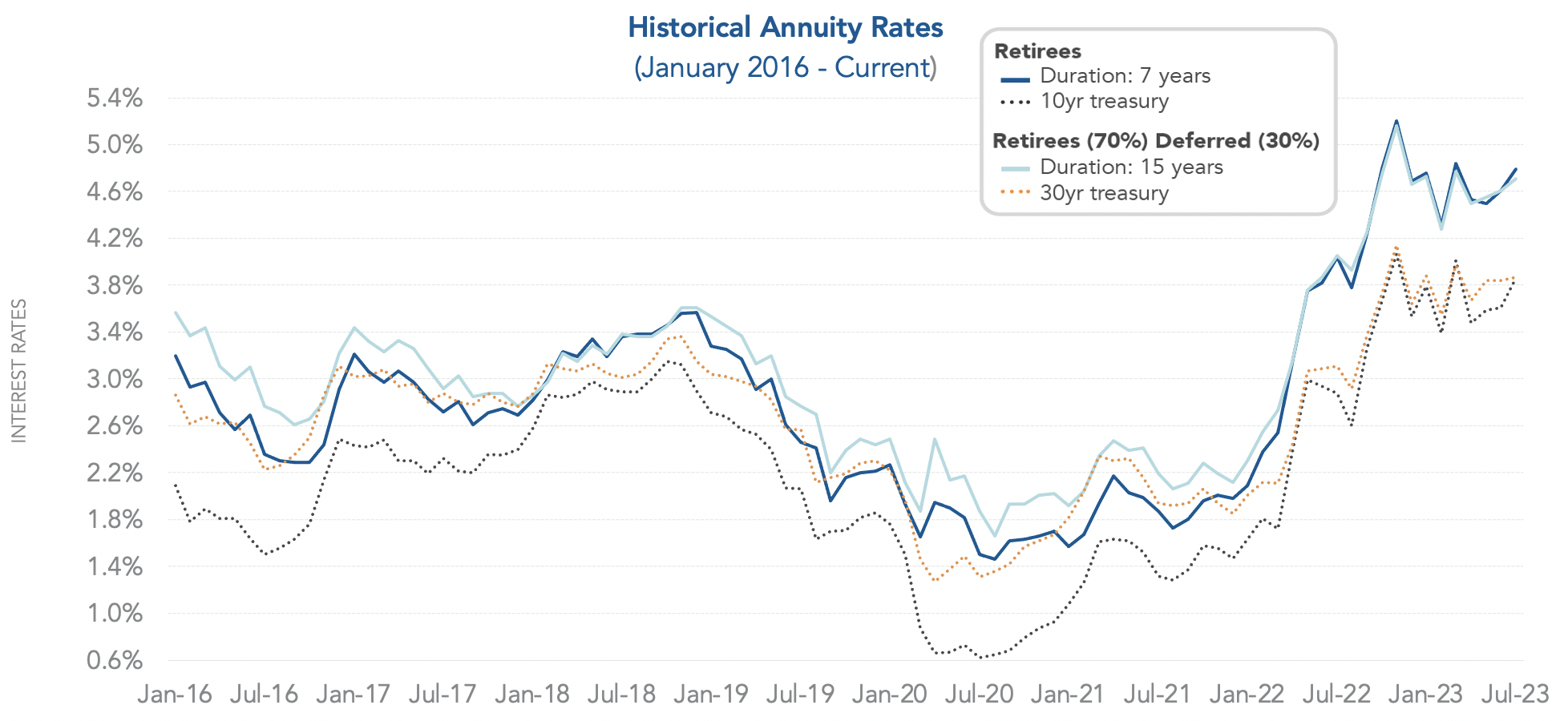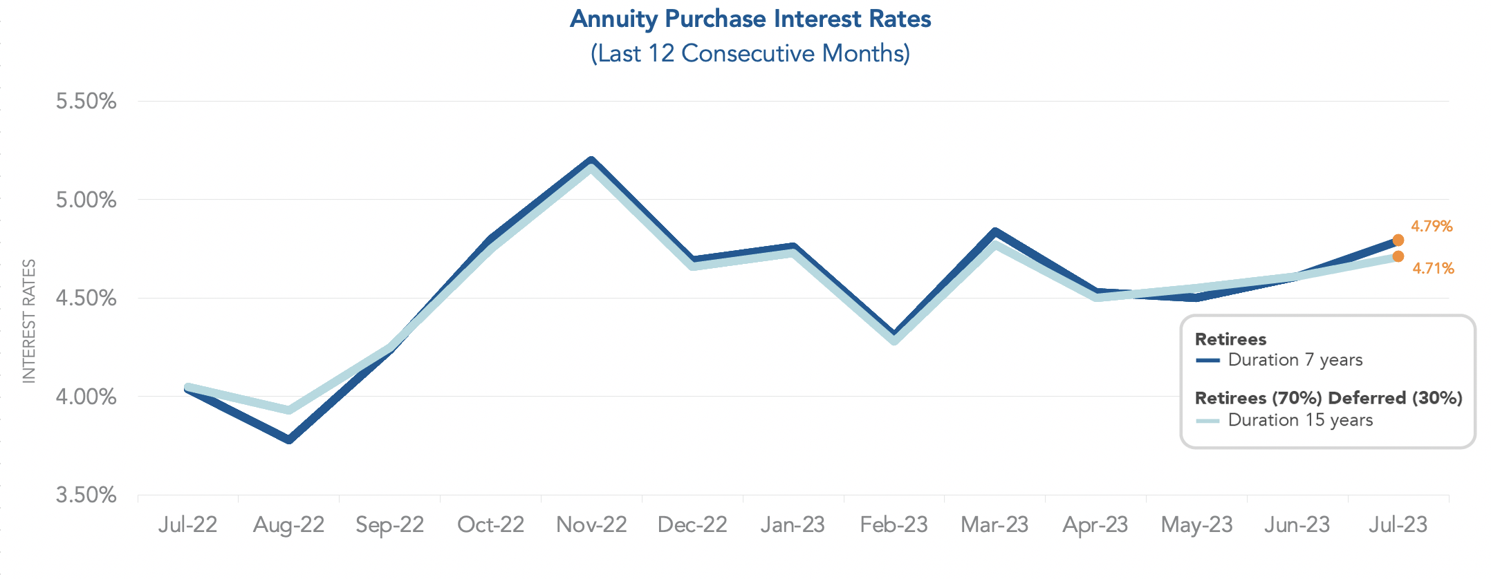 Annuity purchase interest rates rose for the second month in a row, with the average Duration 7 annuity purchase interest rate at 4.79% and the average Duration 15 annuity purchase interest rate at 4.71%. The spread between the 10-year treasury rate and 30-year treasury rate narrowed, placing the two rates one basis point apart. As of the beginning of July, the 10-year treasury rate increased to 3.86% and 30-year treasury rate bumped to 3.87%. Due to favorable interest rates thus far in 2023, the marketplace continues to stay busy and insurers are already preparing for the fourth quarter rush. Some insurers are even experiencing capacity constraints given the volume of placements. Entering the marketplace in a timely manner is important in order to maximize savings.