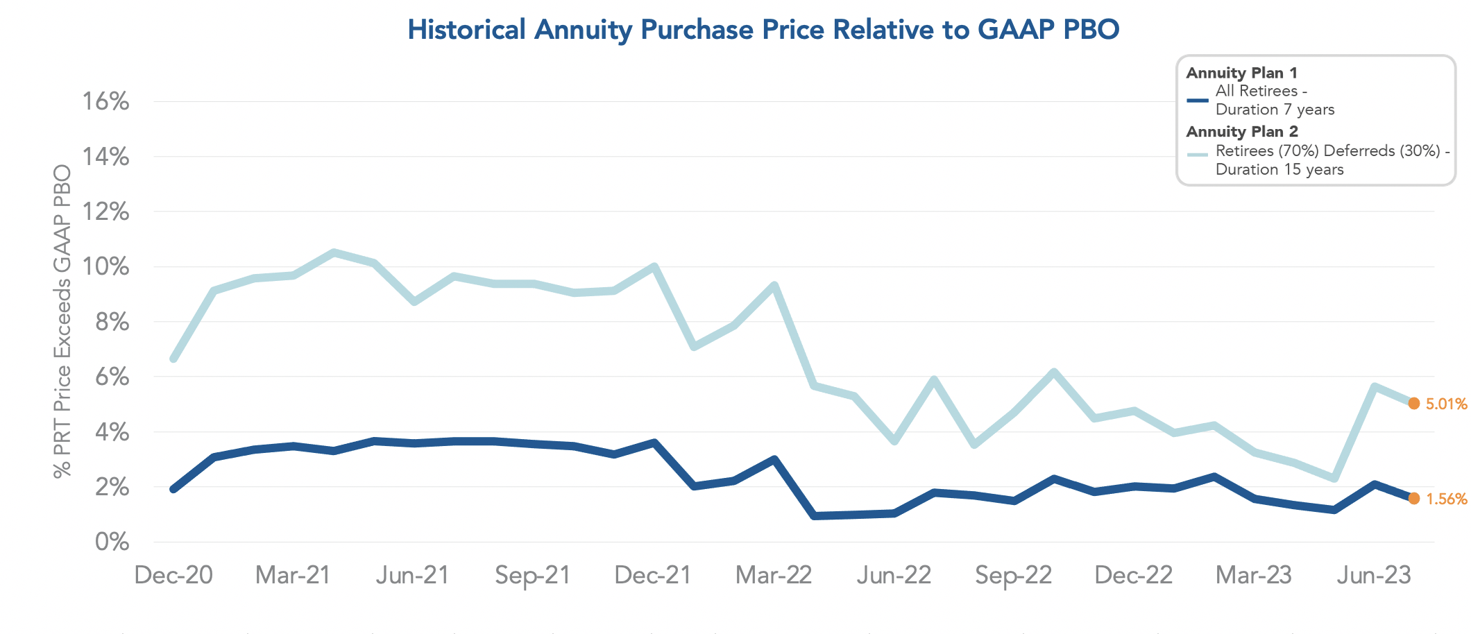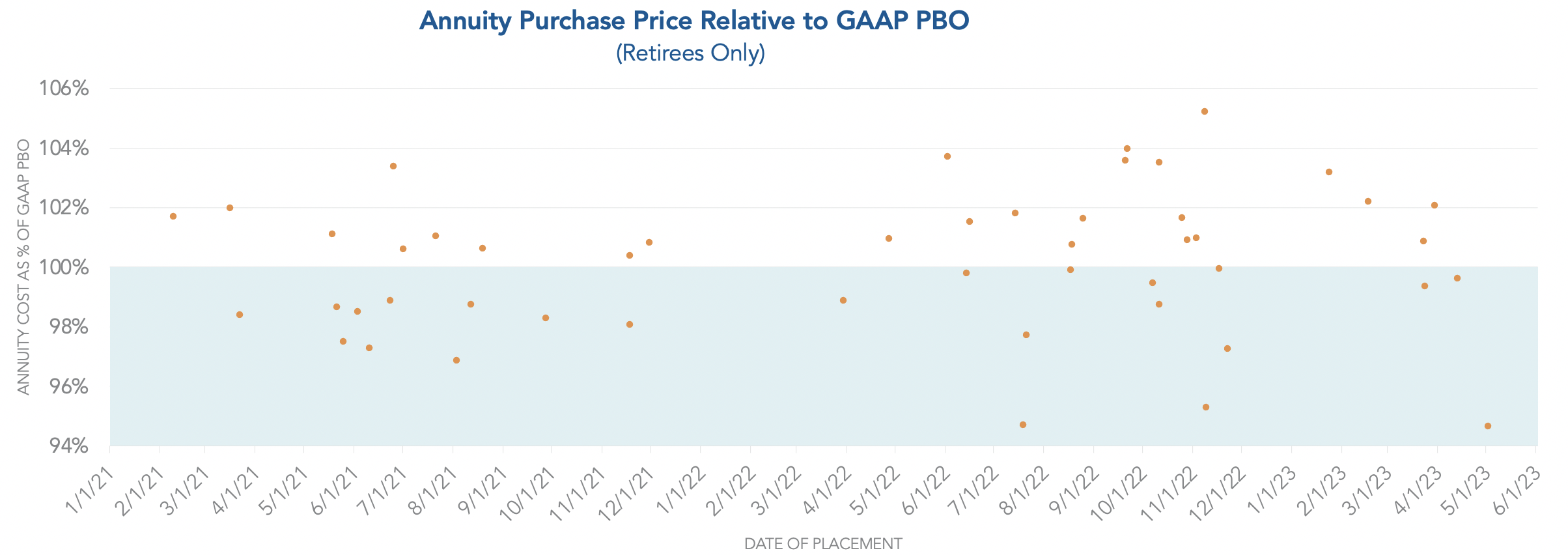 The graph below represents the annuity purchase price relative to GAAP projected benefit obligation (PBO) of the retiree cases placed by October Three Annuity Services since 2021. As we transition into the third quarter with high interest rates and increased plan funding, we will continue to see more placements at October Three. In the first half of 2023, annuity purchase cost for retirees was on average 100.28% of GAAP PBO. Historically, the vast majority of market activity occurred in the third and fourth quarters. This year, insurers have experienced a consistent rush which they anticipate will remain in the second half of the year.