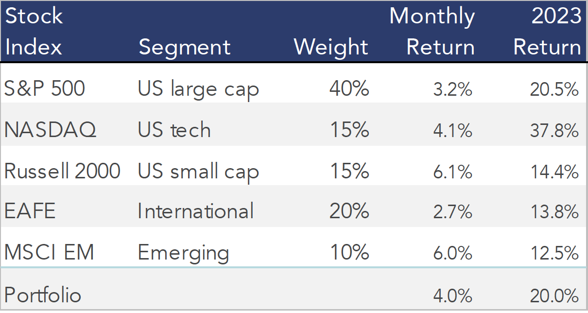 Stocks gained ground again in July, with all major indexes now boasting double-digit increases this year. A diversified stock portfolio gained 4% during July and is up 20% through the first seven months of 2023: